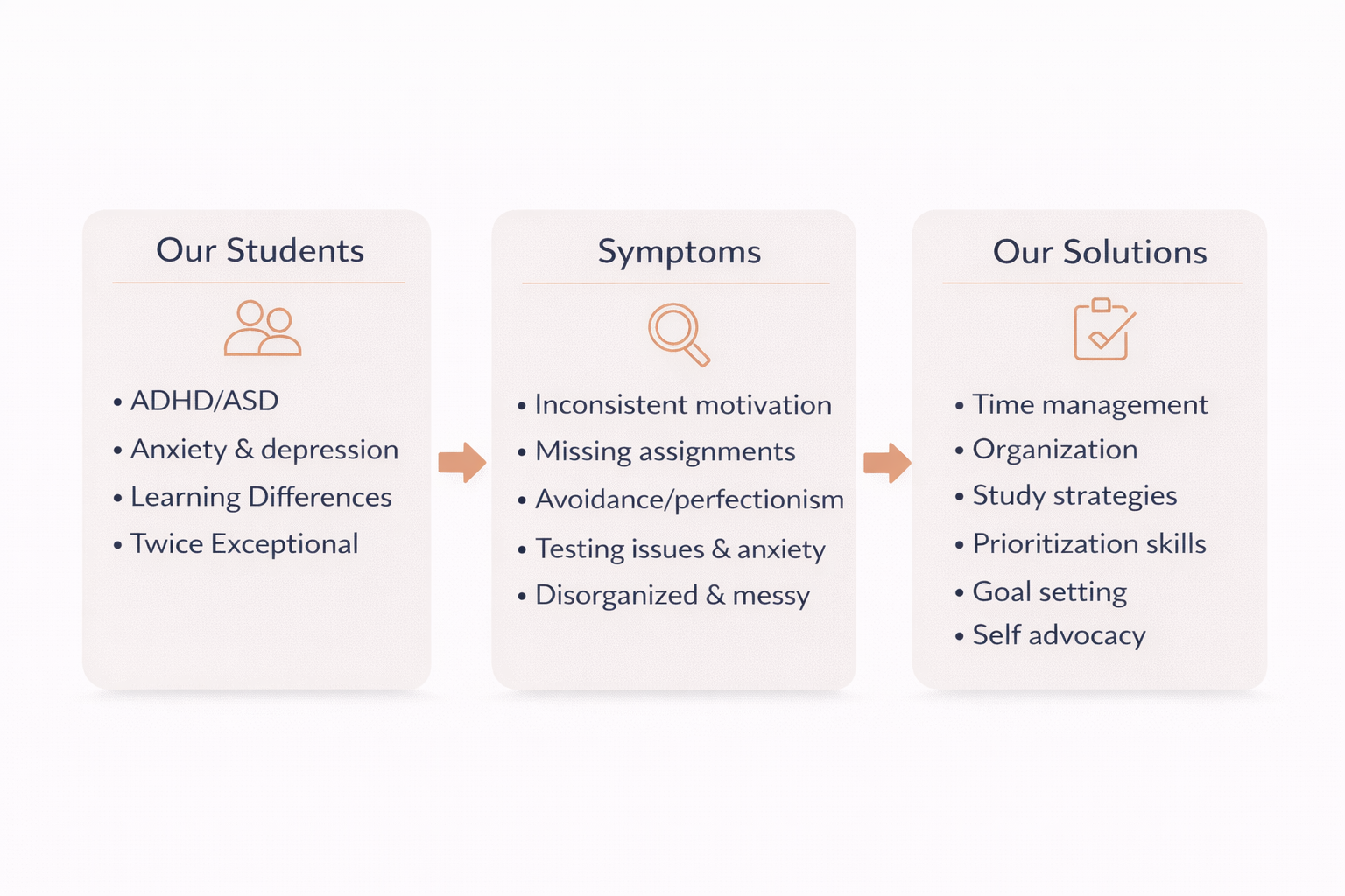 So often academic support is focused on a single subject or assignment. As parents, you know that understanding the material is often not the issue for your child. It’s the fact that they do not always do their work, have inconsistent test scores, lose materials, have low motivation, and are prone to avoidance.